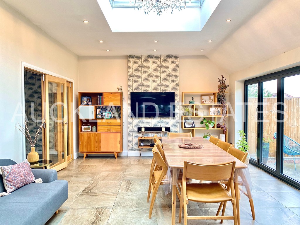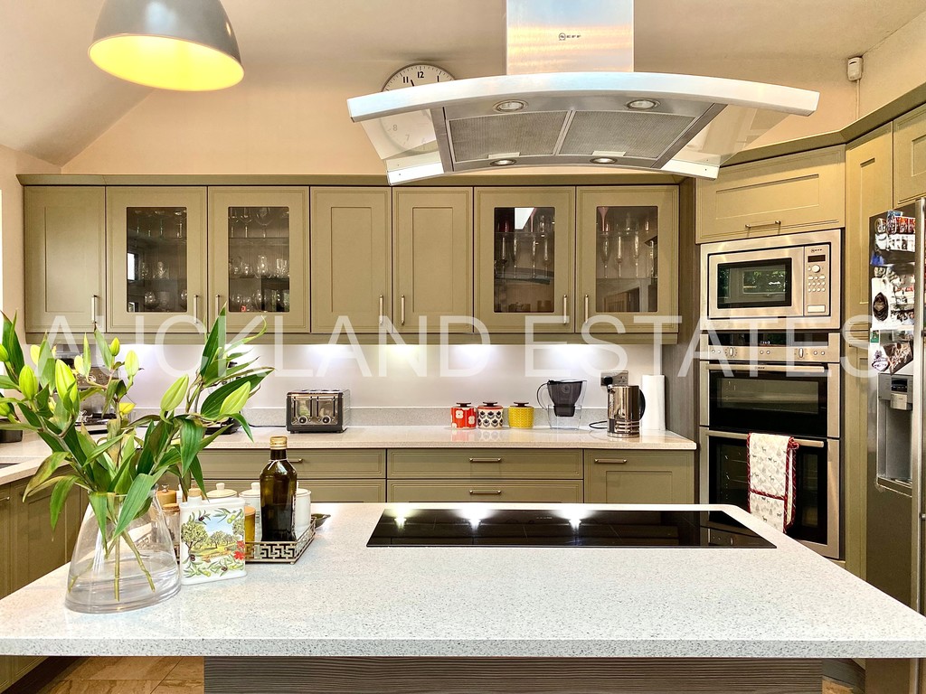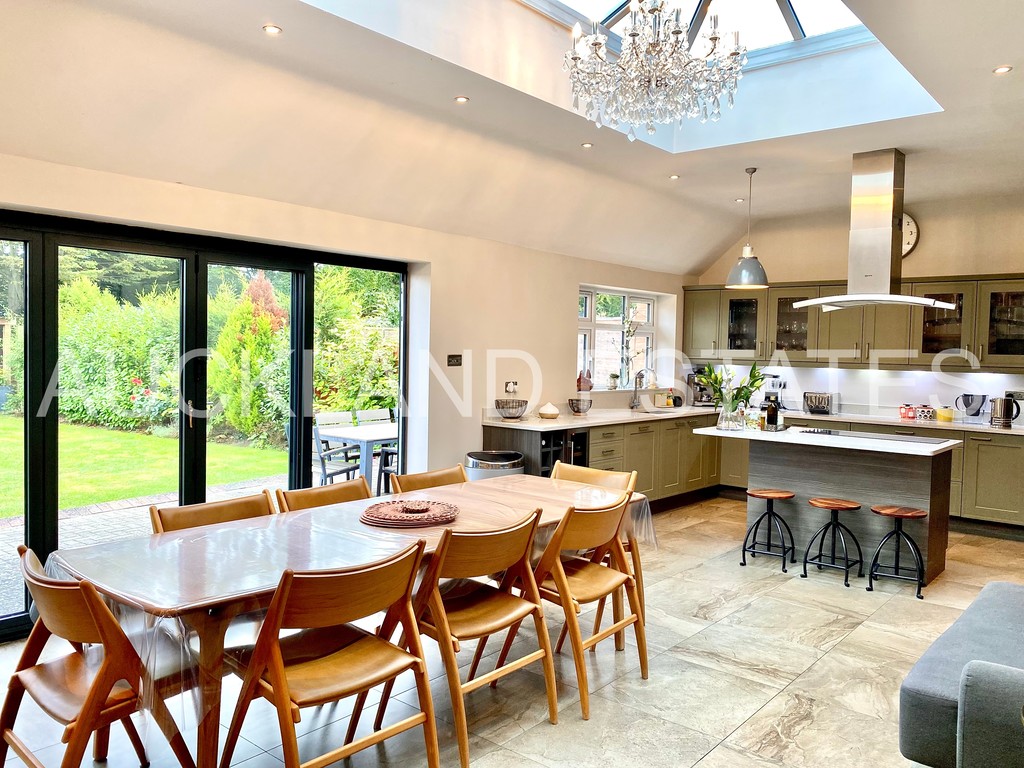 Featuring a Stunning Open Plan Kitchen and Dining area, with Large Lantern Skylight, Bi-Fold doors leading out to a huge Landscaped Rear Garden, ideal for family living and entertaining. The luxury modern kitchen comes fully equipped with top quality appliances, kitchen island, and a wine cooler.