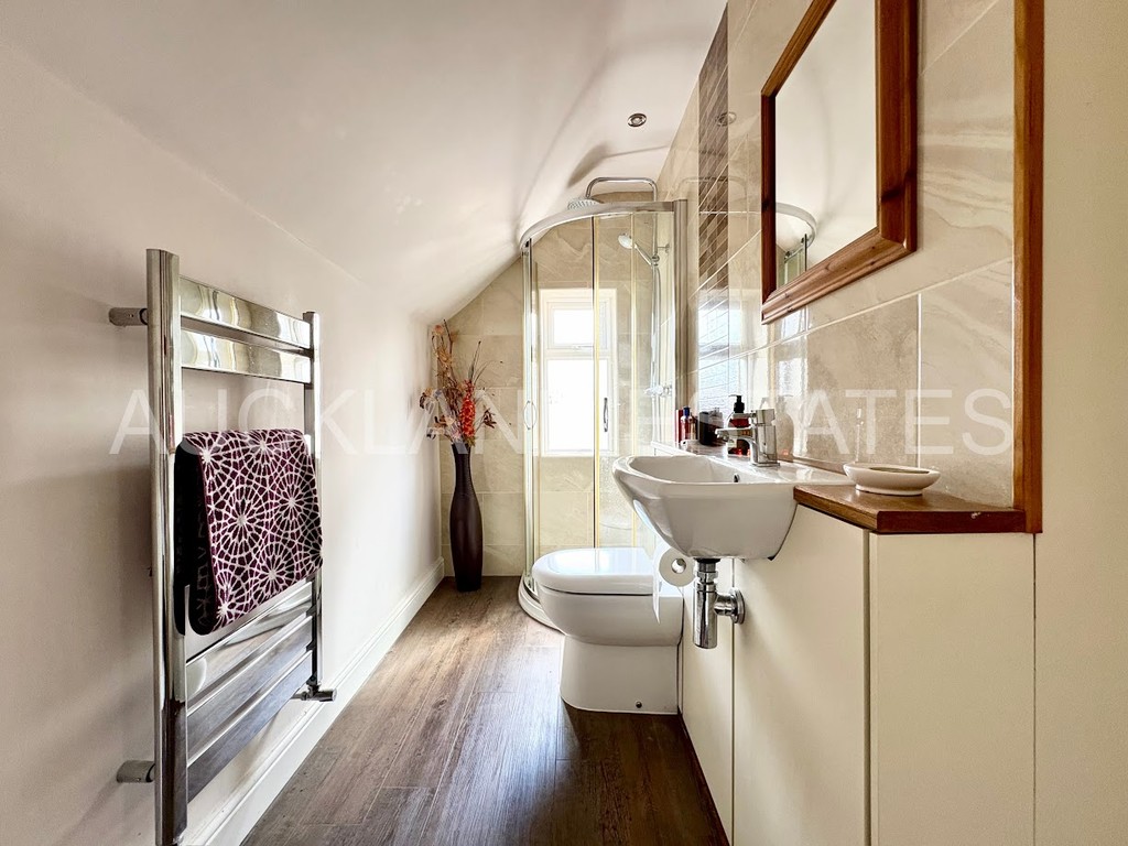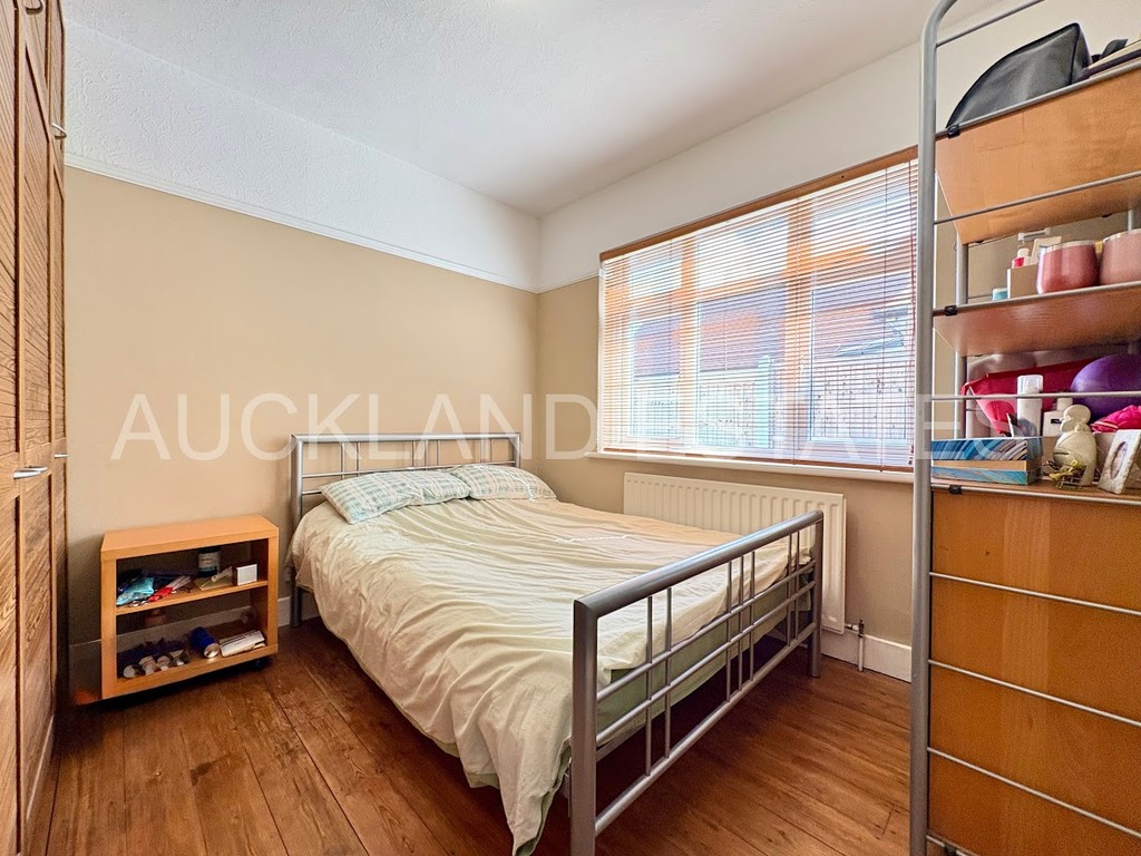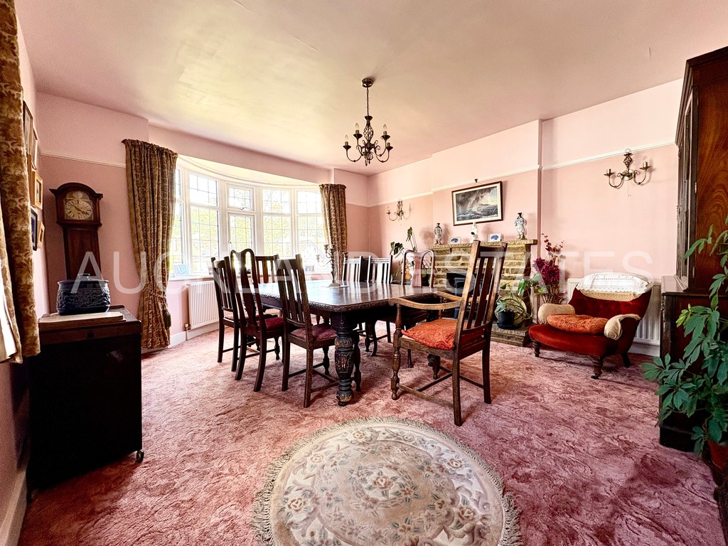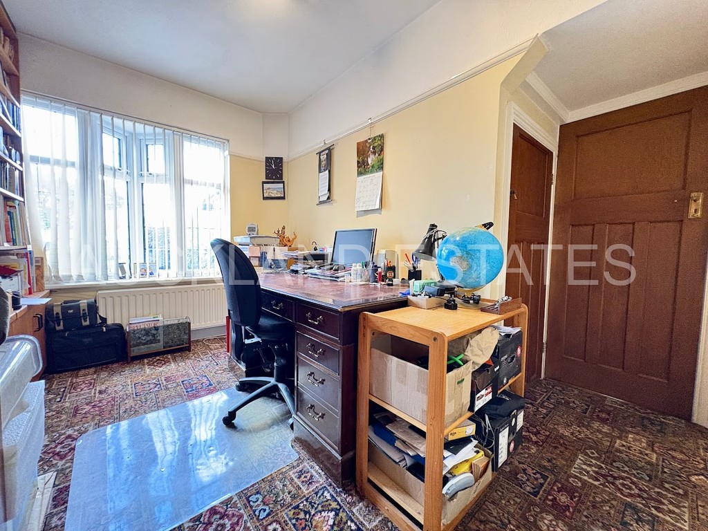 The ground floor comprises two well-proportioned bedrooms: one currently utilised as a study, perfect for working from home, and the other as a comfortable spare bedroom for guests. To the front of the home, a bright dining/reception room with a charming bay window provides a welcoming space, while to the rear, a spacious living room opens directly onto the garden and features a beautiful 1930’s Clay-Gate fireplace in working order, making it ideal for both everyday family living and entertaining.