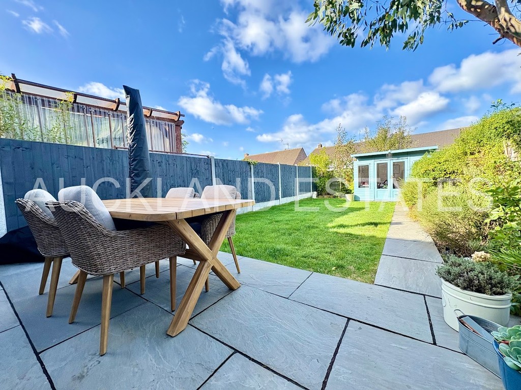 Outside, the rear garden has been lovingly maintained and offers a peaceful retreat, featuring a patio area, lawn, and a stylish summer house at the bottom of the garden – complete with power, making it ideal for a home office, studio, or relaxing space. The property also features a garage en-bloc.