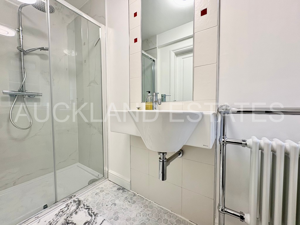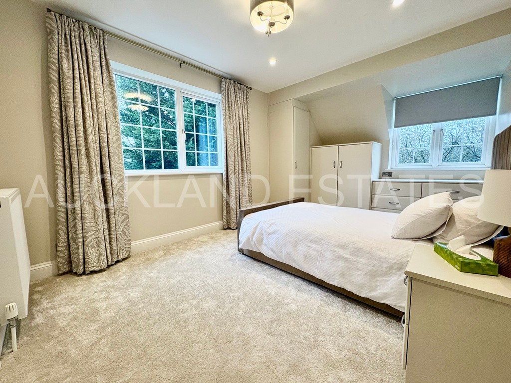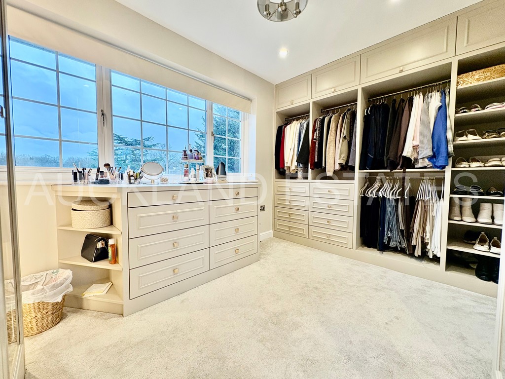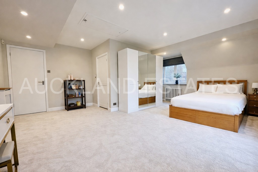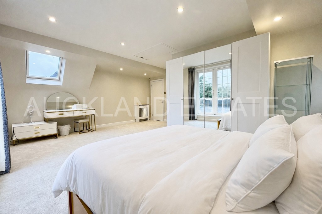 A striking and light-filled staircase rises to a spacious open landing, enhanced by a large feature window which floods the space with natural light. The principal bedroom suite offers excellent proportions, extensive storage and a separate dressing area with bespoke fitted wardrobes. Cleverly concealed within the dressing room is a discreet door leading to a newly refurbished ensuite bathroom, finished with a large walk-in glass shower, modern vanity unit and elegant tiling to walls and floors. Four further double bedrooms complete the first floor, two of which benefit from their own ensuite bathrooms, with Bedroom Two also enjoying access to a private roof terrace. With four bathrooms serving the first floor, this home is ideally suited to larger or growing families.