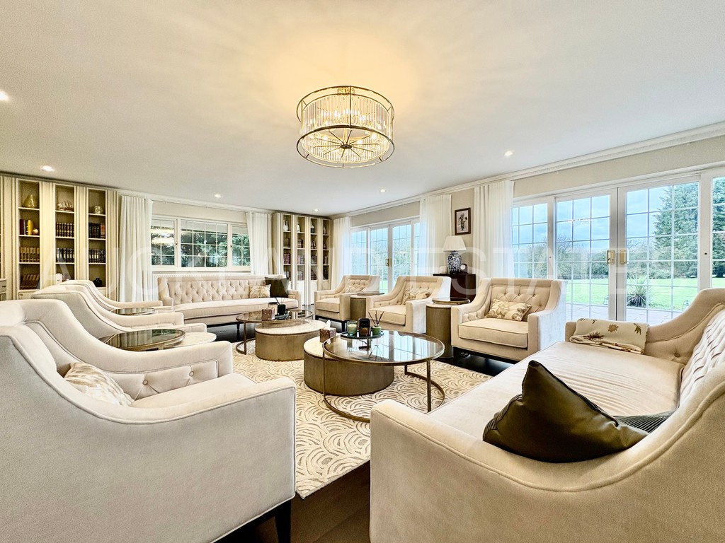 Internally, the property opens into a grand entrance hall with stunning tiled flooring, immediately setting the tone for the high standard carried throughout. The ground floor offers three beautifully proportioned reception rooms, each enjoying views across different aspects of the landscaped grounds, creating versatile living and entertaining spaces. The impressive kitchen diner provides generous space for family life and entertaining, complemented by a separate utility room and a downstairs WC, all finished to a contemporary and luxurious specification.