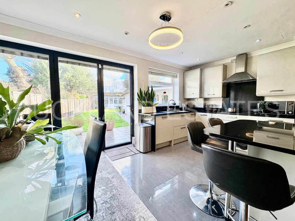 The ground floor provides well-balanced living space, featuring a bright bay-fronted living room alongside a separate dining room with bi-fold doors opening onto the rear garden, creating an ideal setting for both everyday family life and entertaining. The spacious kitchen/breakfast room is fitted with a range of modern units and further bi-fold doors, allowing natural light to flood the space while seamlessly connecting indoor and outdoor living.