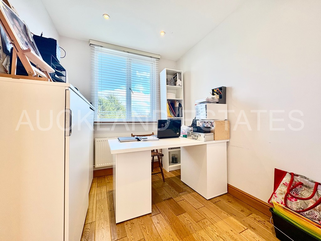 To the upper floors, the property offers five well-proportioned bedrooms and two bathrooms, including a top-floor principal suite with fitted storage and a bathroom featuring a jacuzzi bath, providing comfortable and flexible accommodation for larger families or those requiring home office space.