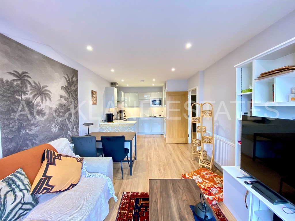 The apartment features a spacious double bedroom with built-in storage, a contemporary open-plan living and dining area, and a fully fitted kitchen with integrated appliances and sleek cabinetry. The bathroom is finished to a luxury standard, complete with premium fittings and a walk-in shower. Tastefully furnished throughout, the property offers both comfort and sophistication in every detail.