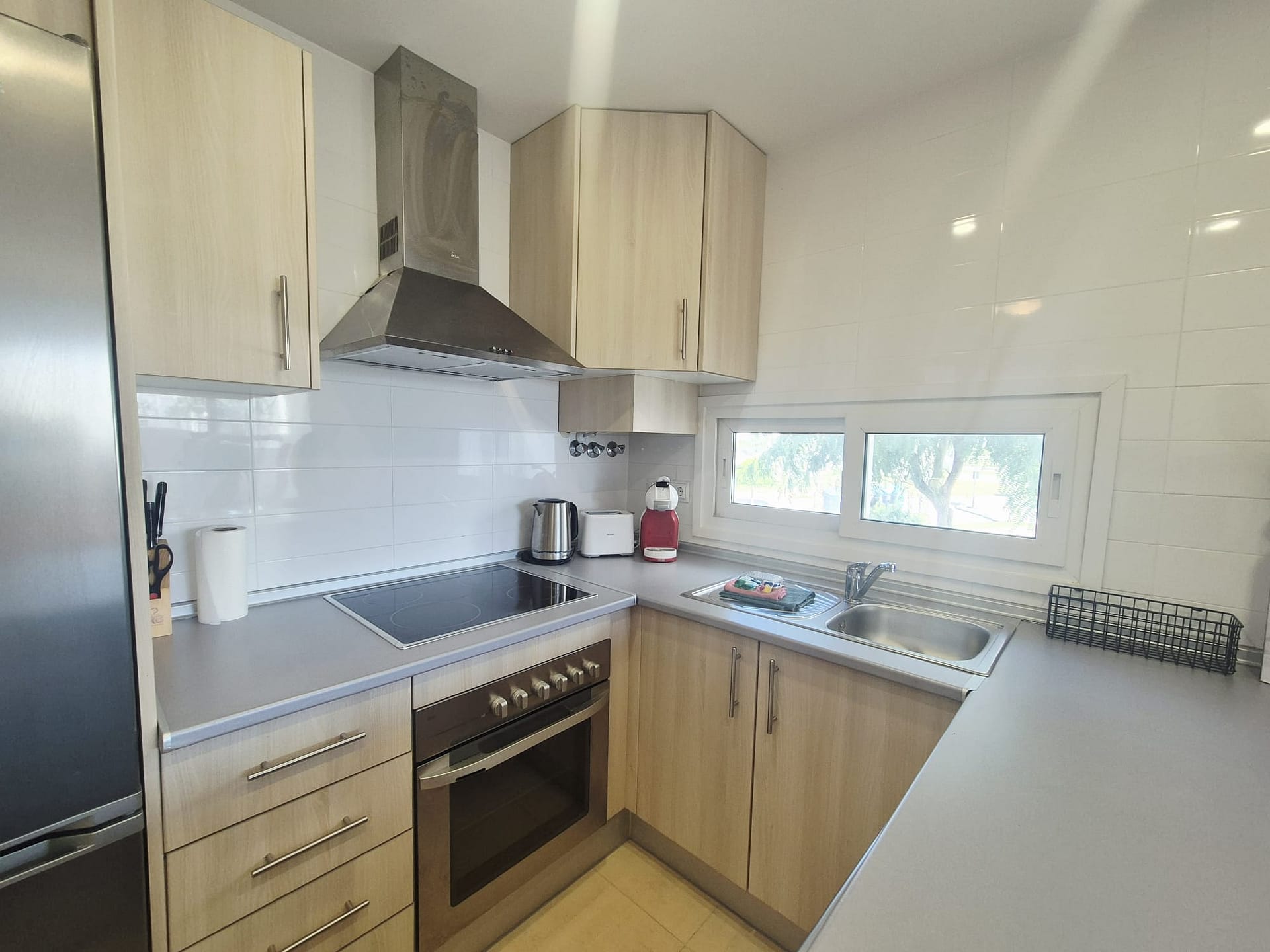 The modern kitchen is fully equipped with quality appliances and ample storage space, perfect for home cooking or entertaining guests. Both bedrooms are generously sized, featuring built-in wardrobes and large windows that bring in the regionâs famous sunshine. The contemporary bathroom is sleek and practical, fitted with modern fixtures and a walk-in shower.